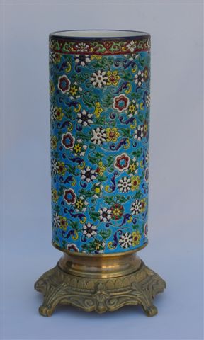 VASE rouleau. Monture en bronze. Décor d'inspiration Napoléon III sur fond bleu (N°3051).