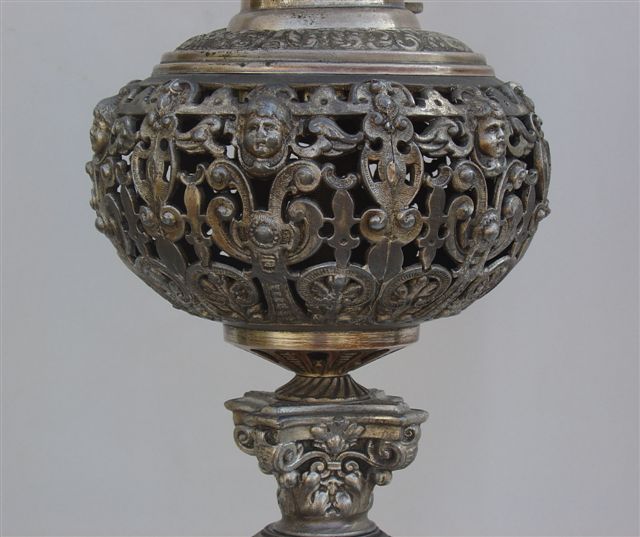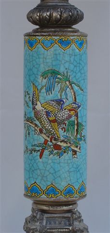 LONGWY - Lampe à pétrole. Monture et réservoir en métal ajouré de style Renaissance. Fût à décor double face de perroquets et d'un papillon sur fond turquoise craquelé. Chapiteau corinthien joignant le fût au réservoir.