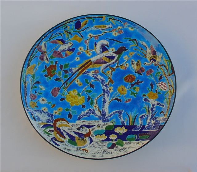 PLAT. Décor aux oiseaux et papillon dans les arbres et les fleurs sur fond bleu (D 186 manuscrit).