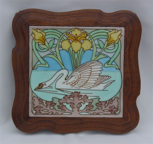 DESSOUS-DE-PLAT. Carreau à décor au cygne et aux iris jaune, dans une monture en bois mouluré.