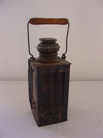 Lanterne en fer avec lampe à alcool, parois en verre coloré rouge, munie d'une poignée. Marque GILLET FOREST & Cie. Haut. 28 cm.