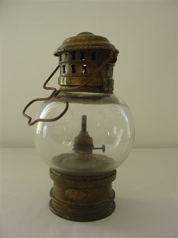 Lanterne de forme bombée en fer et verre, réservoir à essence, marque E. RESNARD. Haut. 27 cm.