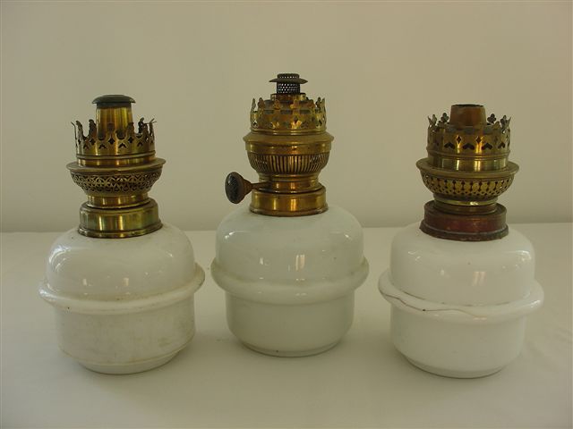 3 lampes à pétrole, réservoir en opaline blanche, dont une marque MATADOR. Haut. 21 cm.