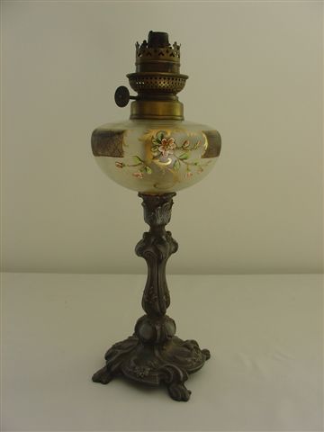 Lampe à pétrole, toupie en verre peint polychrome et doré à décor de fleurs et croisillon, piètement en étain de style L. XV. Haut. 39 cm.