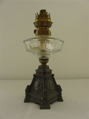 Lampe à pétrole, toupie à pans en verre, piètement pyramidal en étain à décor de portraits en médaillon. Marque KOSMOS. Haut. 35 cm.