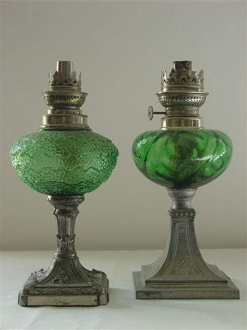 2 lampes à pétrole, toupie en verre coloré vert, piètement à base carrée en étain ou métal composite. Haut. 30 cm.