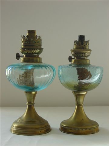 2 lampes à pétrole, toupie en verre bleuté, piètement à base circulaire en laiton. Haut. 28 cm.