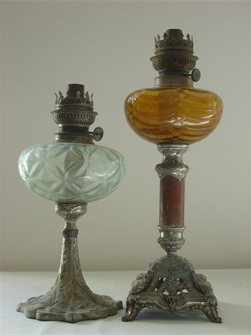 2 lampes à pétrole, toupie en verre coloré, piètement en métal composite dont un à décor ajouré de panier fleuri et fût imitation marbre. Haut. 34 et 41 cm. (accdt)