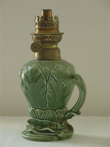 Lampe à pétrole, réceptacle en céramique verte à décor de feuillages et anse en forme de branchage. Haut. 23 cm.