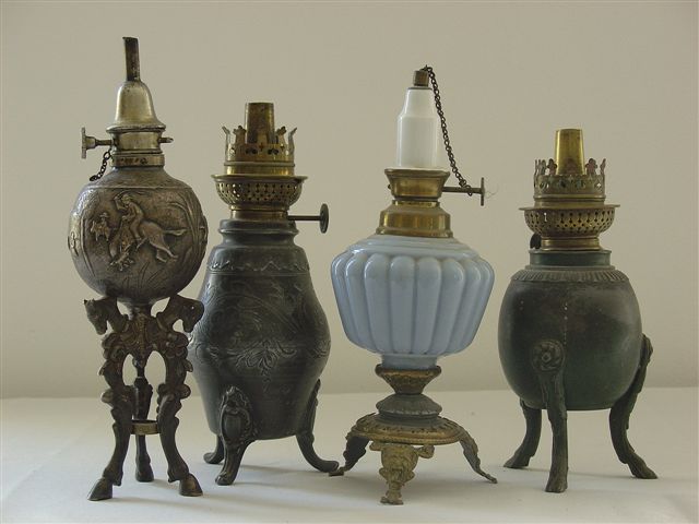 Lot de 4 lampes : 3 en métal composite, 1 en opaline. Piètement tripode. Haut. 24 cm. (accdt)