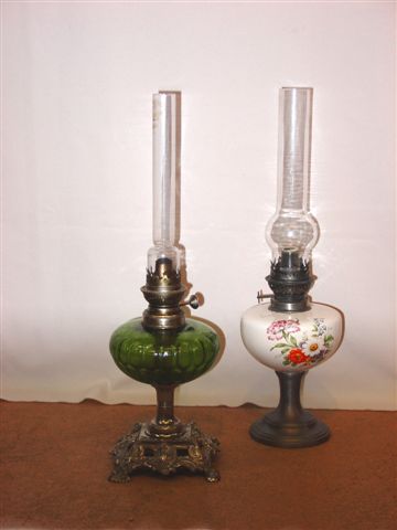 Deux LAMPES à pétrole. La première à piètement quadripode en métal de style Louis XV avec réservoir en verre vert (fêle au verre de lampe, Haut. 50 cm.) et la seconde à pied circulaire en métal avec réservoir en céramique blanche à décor fleuri (Haut. 50,5 cm.)