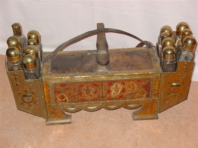Haut. 38 (avec les flacons en place), long. 65, larg. 19 cm.