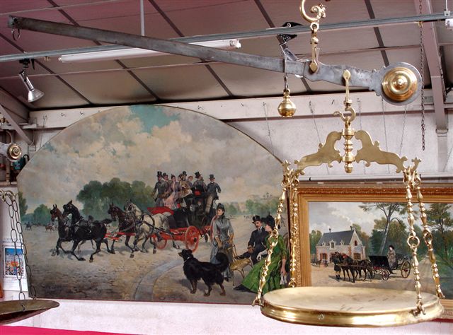Crochet de suspension en volute feuillagée orné d'une tête de boeuf. Plateau concave en laiton et bronze retenu par 4 chaînes à éléments balustres. Poids mobile spherique. Poinçons de contrôle.