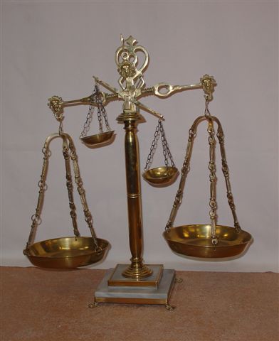 BALANCE double en bronze, à grands et petits plateaux. Piètement quadrangulaire en marbre gris aux griffes de lions. Ornementation de masques féminins à l'extrémité des bras et sur l'aiguille.
