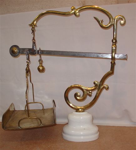 Paire de BALANCES romaines en bronze et fer, graduées de 0 à 5. Piètement ovale en marbre blanc supportant un arc à volutes. Poids mobile spherique. Un plateau circulaire retenu par trois chaînes, et un rectangulaire.