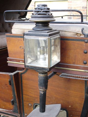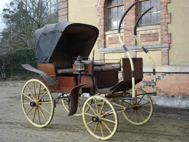Caisse carrée à panneau arrière en carrick, petites portes latérales ; banquette avant à jupe en bois et côtés droits à galerie, banquette arrière à haut dossier et capote en cuir à double compas, passage de roue en carré. Coffres sous les banquettes. Garde-crotte et ailes en bois cintré. Avant-train à rond simple, sellette à douille et lisoir cintrés, ressorts à pincettes à mains à l'anglaise. Frettes quadrillées. Arrière-train à ressorts à pincettes à mains à l'anglaise. Essieux cintrés. Roues à bandages en fer (diamètre avant : 85 cm, arrière : 113 cm). Frein à levier.