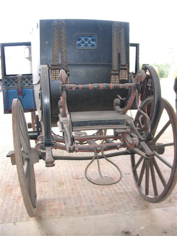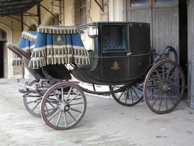 Caisse ronde suspendue, panneau avant à une vitre, panneau arrière à lunette ; portes ouvrant vers l'arrière, à persiennes peintes en rouge et noir, vitres coulissantes à châssis gainés de velours vert. À l'avant, siège de cocher sur petit coffre-tonneau (que les anglais appellent Salisbury boot) à coquille sur traverse et lisoir ; à l'arrière planche de laquais sur traverses, montants à crosses réunis par une traverse.