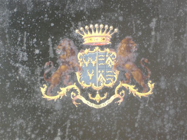 Il est peint sur les portes les armoiries des familles Le Gras du Luart et Barbin de Broyes avec deux supports de lions debouts et la devise « NE VARIATUR » des Le Gras du Luart, surmontées d'une couronne de comte, et sur la coquille et les panneaux de côtés la couronne de comte avec la devise.