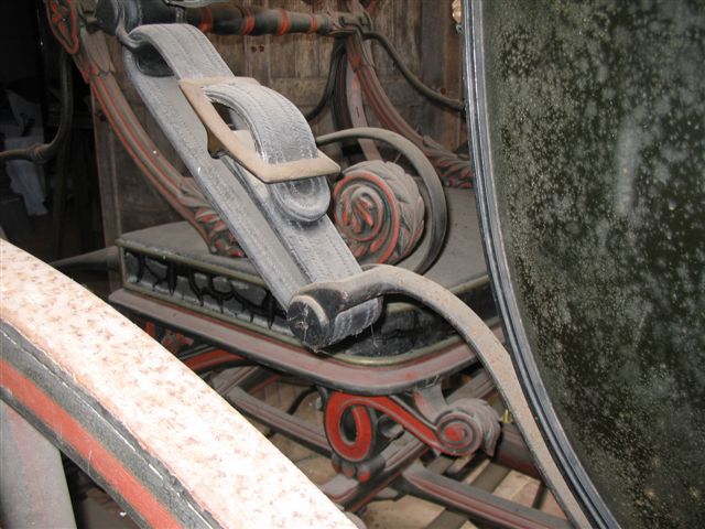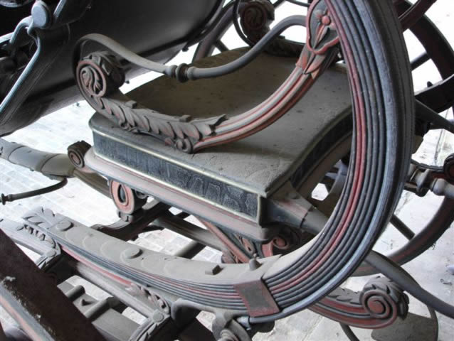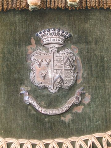 Garniture en bronze argenté : plaques d'armoirie sur la housse, poignées de portières ajourées de fleurons et timbrées d'une couronne de comte, cinq « jarretières » (manque une) à devises surmontées de la couronne sur le haut des panneaux de custode.