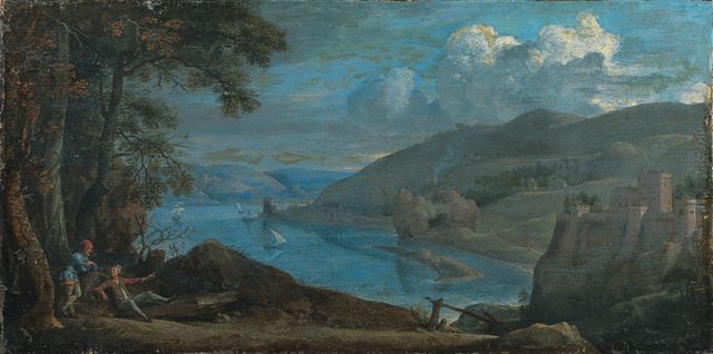 École FLAMANDE vers 1700. Paysage fluvial. Toile.34 x 66,5 cm....