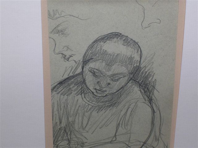 Etude de personnage en buste tête baissée et de deux visages de profil.