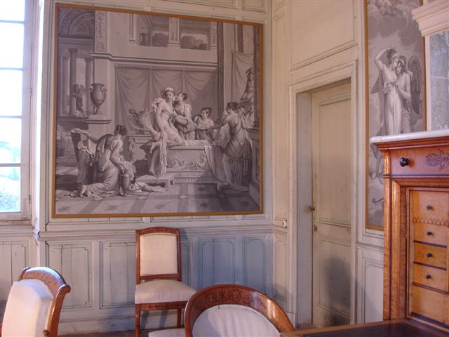 Cinq scènes sur les douze s'inspirent des gravures de Gérard (BN, Est., Dc 55a f° 72) pour l'édition Didot et une de Prud'hon, Psyché enlevée par les Zéphyrs. L'attribution, par Clouzot, de la composition du décor à Blondel et Laffitte, qui ont probablement servis d'intermédiaires entre l'oeuvre de Gérard ou Prud'hon et le papier peint, repose sur deux dessins provenant de la famille Dufour.