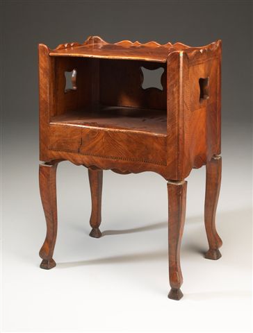 CHEVET formant BIDET en bois de placage galbé. La partie supérieure chantournée se compose d'un plateau mobile et présente des fenêtres quadrangulaires. Elle s'ôte et découvre le piètement supportant une cuvette en faïence polychrome à décor d'oiseaux perchés, d'insectes et de fleurs.