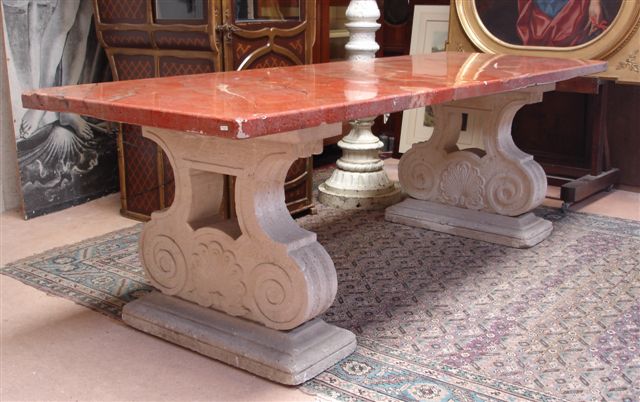 TABLE rectangulaire en pierre. Piètement constitué de deux soubassements-consoles de volutes accolées enserrant une coquille rayonnante.