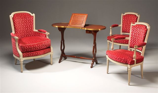 Dossier dit "à chapeau de gendarme". Consoles d'accotoirs en balustre cannelée. Pieds fuselés, cannelés et rudentés.