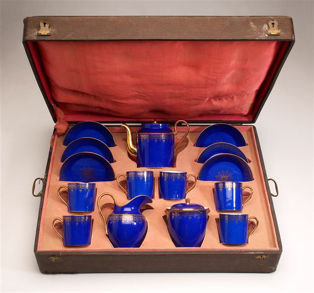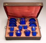 Comprenant une cafetière, un sucrier, un pot à lait, six tasses litron et leur sous-tasse. Fond bleu roi à décor en frise de rinceaux, lambrequins et filets or. Anses et bec verseur dorés.