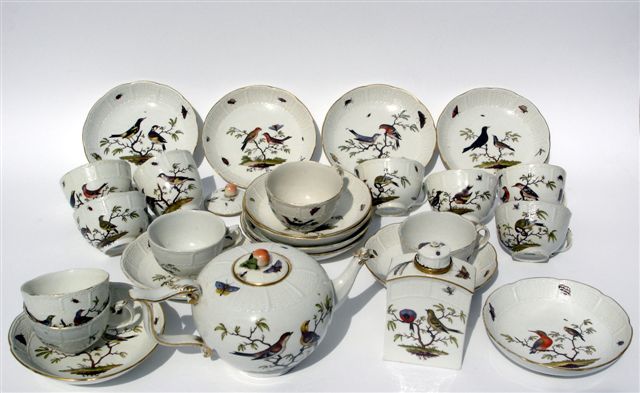 SERVICE à THÉ de 27 pièces à décor polychrome finement peint au naturel d'oiseaux branchés - certains identifiables - d'insectes et de papillons au fond des tasses.