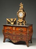 CARTEL en marqueterie de cuivre de style Boulle sur fond d'écaille brune. Riche ornementation de bronzes redorés et ciselés de style rocaille.