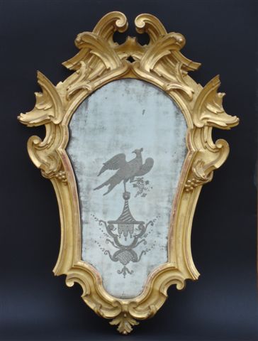 MIROIR en bois sculpté et doré de volutes, feuilles d'acanthe entremêlées et grappes de raisin.