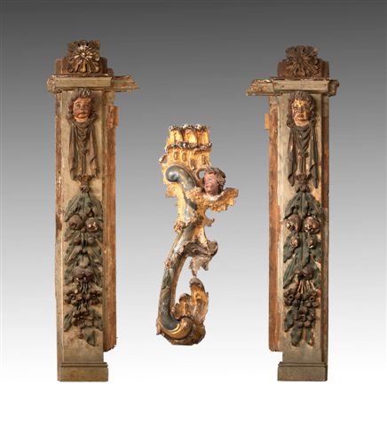 Paire d'éléments d'ARCHITECTURE en bois sculpté.