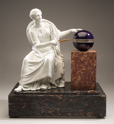 PENDULE à cercles tournants, représentant URANIE pointant une mappemonde à l'aide d'un compas en bronze.