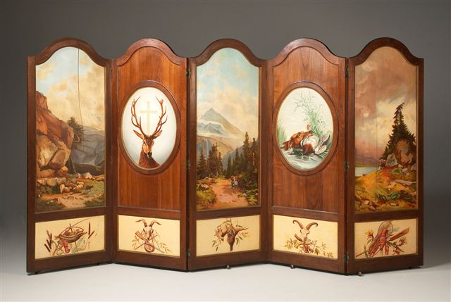 PARAVENT en chêne à cinq feuilles en chapeau de gendarme à décor peint en encadrement sur une face.