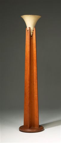 LAMPADAIRE en chêne. La base ciculaire, le fût à section cruciforme fuselé soutenant un abat-jour en métal laqué crème à profil escalier à sa base et évasé.