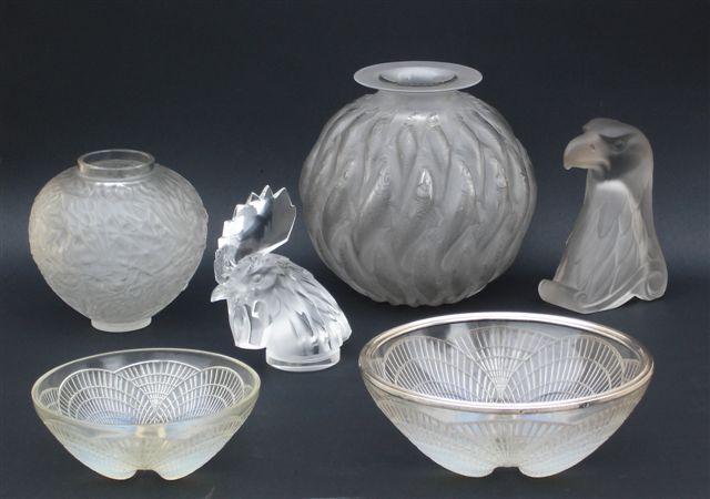 Coupe "COQUILLES n° 1". Verre blanc moulé-pressé opalescent à quatre coquilles rayonnantes. Signature "R. LALIQUE" en relief, moulée, au centre. Bordure cerclée d'argent, poinçon Minerve.