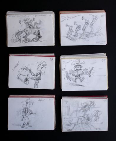 Environ 650 dessins au crayon de MORRIS avec indications de mise en scène et de dialogue manuscrites au stylo bille bleu.