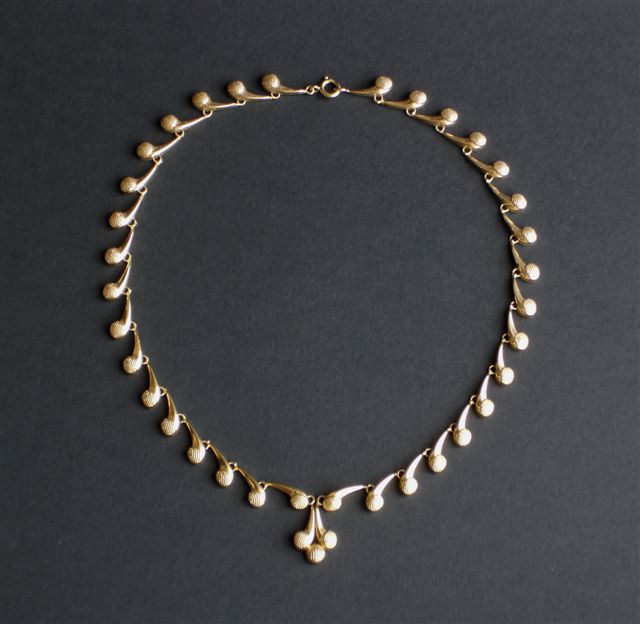 COLLIER articulé en or jaune à motifs de volutes lisses et guillochées. Travail des années 1950.