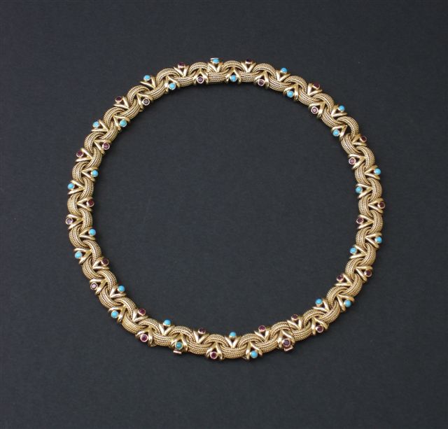 COLLIER en or à motifs de demi-anneau de chaîne, retenus par des petits rubis alternés de turquoises. Division possible en 2 gourmettes ou un ras du cou.