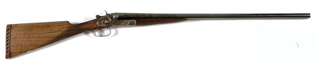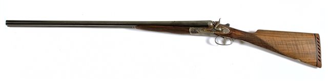 FUSIL DE CHASSE à percussion centrale, chiens extérieurs, deux coups, calibre 12-75 extracteur. Canons juxtaposés de 76 cm, marqué sur la bande « Victor Sarasqueta Eibar ». Platines, chiens, bascule et pontet finement gravés de rinceaux, bleui, jaspé. Double détente. Crosse en noyer de 36,5 cm avec talon de caoutchouc, finement quadrillé, portant un écusson ovale, gravé du chiffre « A » sous couronne Comtale.