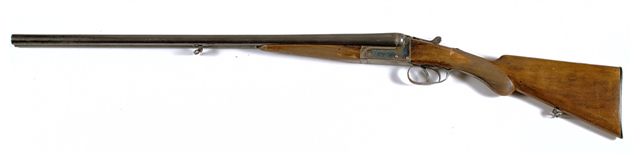 FUSIL DE CHASSE Hammerless, deux coups, calibre 16-65 extracteur. Canons juxtaposés de 68 cm, marqué sur la bande « Fabrica de Escopetas Marca Jabali de Eduardo Schilling Barcelona ». Bascule gravée d'une frise, bleui, jaspé. Double détente. Crosse demi pistolet en noyer, finement quadrillé. Plaque de couche en corne.