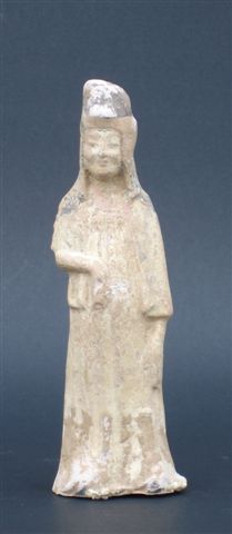 DAME DE COUR debout en terre cuite recouverte d'un fin émail beige craquelé.