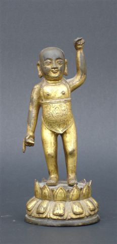 STATUETTE de BOUDDHA enfant debout en bronze doré.
