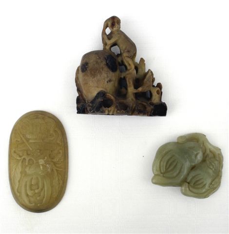 Lot comprenant : une plaque de ruyi en néphrite céladon, un ornement en forme de citron digité en néphrite, et un singe et oiseau en stéatite.