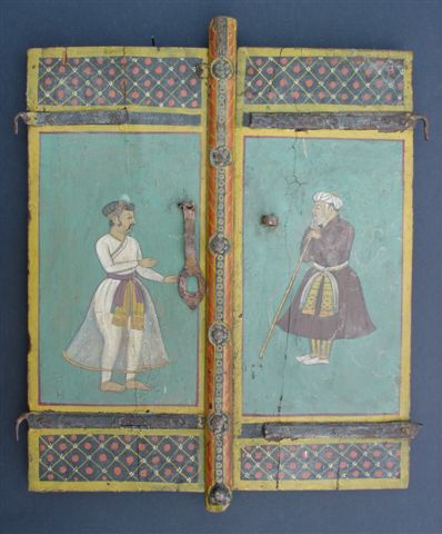 Chaque vantail est décoré d'un personnage sur fond vert. Le premier porte un turban et une canne, le second ouvre les bras en signe de bienvenue. Encadrements, en parties supérieure et inférieure, de croisillons ponctués de rouge sur fond noir. Battée en relief ornée de fleurs stylisées et points. Pentures et crochet central en fer forgé.