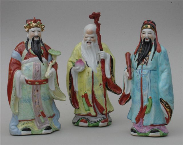 Ensemble de TROIS STATUETTES de personnages debout en porcelaine émaillée polychrome.