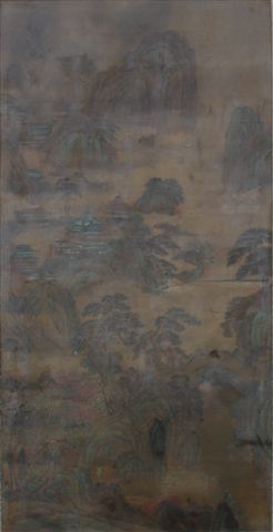 Importante PEINTURE en hauteur, encre et polychromie sur soie, représentant un palais au milieu des nuages. Porte une signature : Chiu Ying.