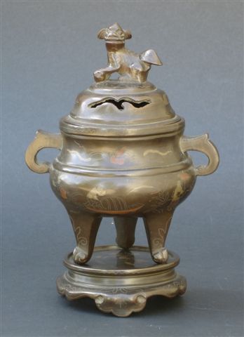 BRULE-PARFUM tripode à deux anses en bronze à patine brune à décor tournant incrusté de paysages animés de personnages. Prise du couvercle en chimère. Socle.